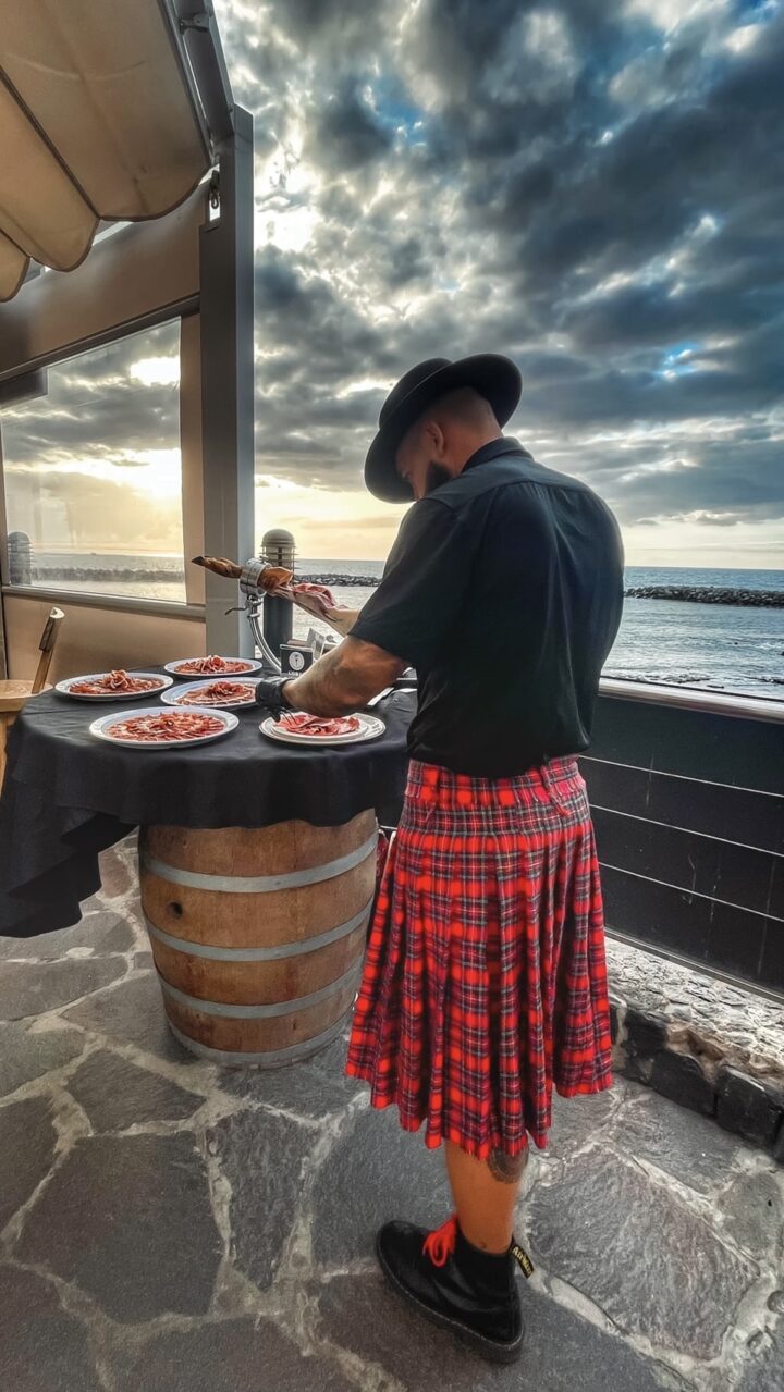 Tenerife, donde el Teide vigila desde las alturas y el jamón se corta al ritmo del Atlántico. Soy Julio García, el Galician Ham Carver, y aparezco en kilt escocés y sombrero cordobés para transformar cualquier evento en un auténtico espectáculo de corte. Aquí no se trata solo de hacer lonchas: se trata de crear momentos con alma.